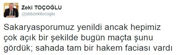 Sakarya'da, Sakaryaspor'un Sandıklıspor'a karşı 1-0 mağlup olduğu maç sonrasında Başkan Zeki Toçoğlu, hakemlerin yönetimini eleştirerek dikkat çekici açıklamalarda bulundu. Sosyal medya üzerinden yaptığı paylaşımda, “Sahada tam bir hakem faciası vardı” ifadesini kullanan Toçoğlu, “1 milyon nüfuslu bir şehrin sevgisiyle böyle oynamak kimsenin hakkı değil. Birileri Sakaryaspor’un şampiyon olmasını istemiyor olabilir, hatta bu ligde başka takımların şampiyon olmasını istiyor olabilirler” dedi. Başkan Toçoğlu'nun bu açıklamaları, futbol camiasında geniş yankı buldu.