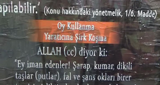 Adapazarı şehir merkezinde, bazı aydınlatma direklerine asılan afişlerde "Oy Kullanma Yaratıcına Şirk Koşma" ifadeleri yer alıyor. Bu afişlerde ayrıca oy vermenin Allah’a şirk koşmak anlamına geldiği savunulurken, çeşitli dini referanslar da kullanılmıştır.