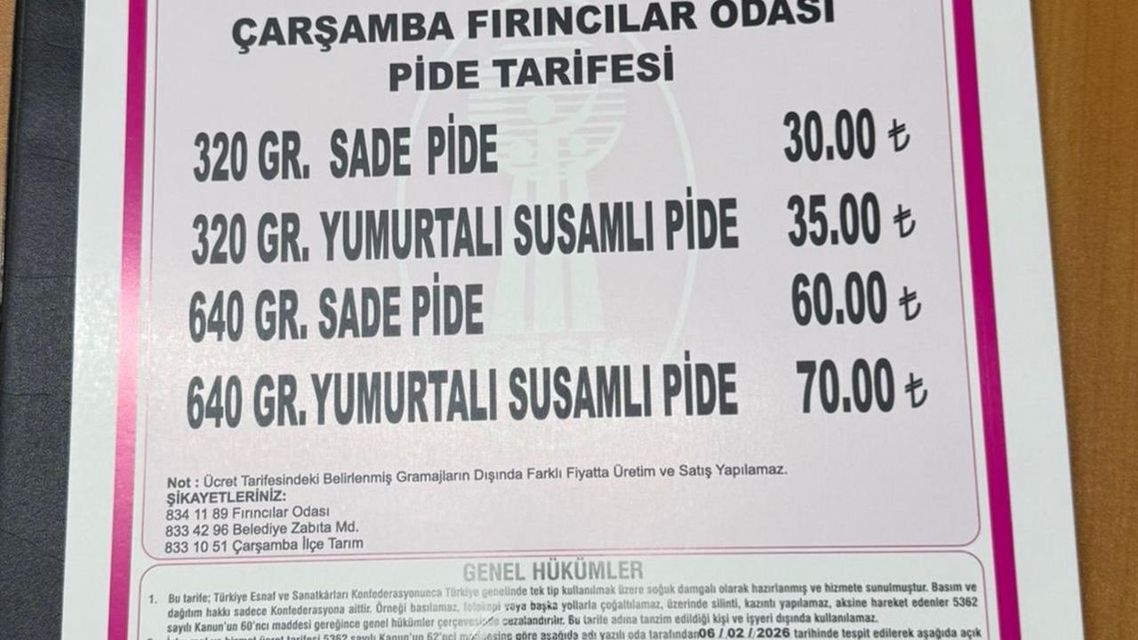 Çarşamba Fırıncılar Esnaf ve Sanatkarlar Odası, 2026 yılı pide fiyat listesini kamuoyuna açıkladı. Bu listeye göre, 320 gram sade pide fiyatı 30 TL olarak belirlenirken, 640 gram sade pide fiyatı ise 60 TL olarak belirlendi. Böylece Ramazan ayında pide severler, uygun fiyatlarla bu lezzetin tadını çıkarabilecekler.