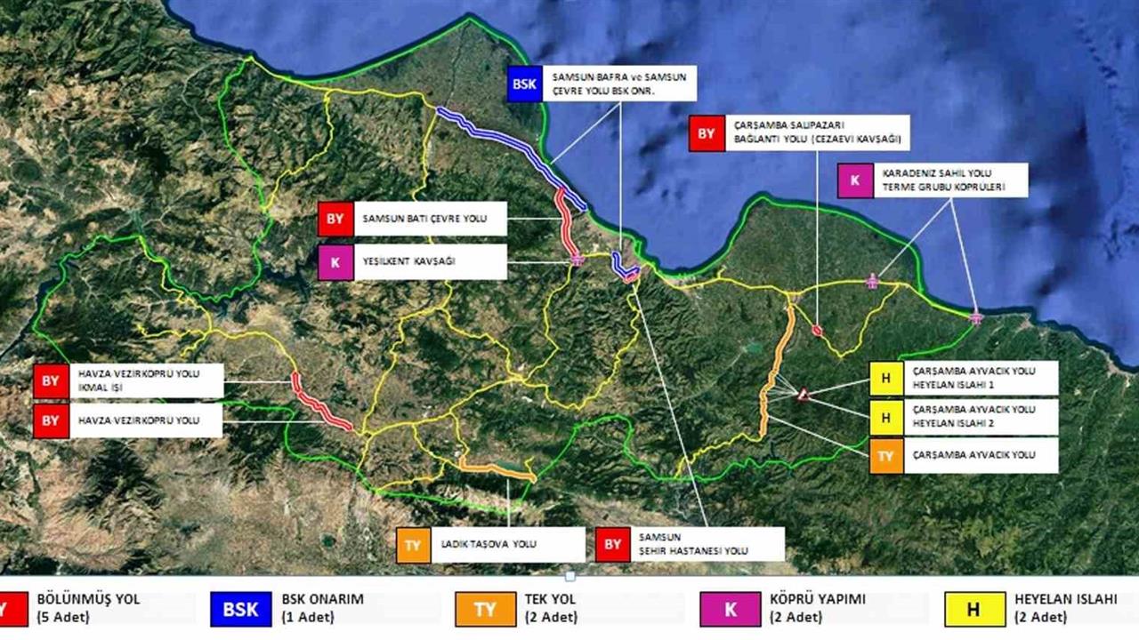742 milyon TL bedelli Samsun Şehir Geçişi Yeşilkent Kavşağı işinde yüzde 90 seviyesine ulaşılmışken, 2 milyar 495 milyon TL proje bedelli Samsun Şehir Hastanesi Yolu’nda ise yüzde 70 ilerleme kaydedilmiştir. 980 milyon TL bedeli olan Çarşamba-Ayvacık Yolu heyelan ıslahı 2 projesi yüzde 86 oranında tamamlanmış, 55 milyon TL proje bedelli Çarşamba–Salıpazarı Bağlantı Yolu’nda fiziki gerçekleşme ise yüzde 87 olmuştur. 700 milyon TL bedelli Karadeniz Sahil Yolu Terme grubu (Terme Anayol ve Karaboğaz) köprüleri yapım işinde ise çalışmalar yüzde 21 seviyesinde devam etmektedir.