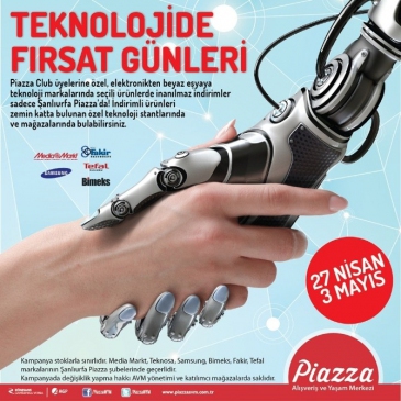 Şanlıurfa Piazza, 27 Nisan-3 Mayıs 2015 tarihleri arasında “Teknolojide Fırsat Günleri” etkinliğini gerçekleştirecek. Bu süre zarfında ziyaretçiler, elektrikli ev aletlerinden beyaz eşyalara kadar pek çok ürünü avantajlı fiyatlarla satın alabilecek. Media Markt, Samsung, Fakir, Tefal ve Bimeks gibi markaların katıldığı kampanya, Piazza Club Kart sahipleri için özel indirimler sunacak. 27 Nisan'dan itibaren zemin katta bulunan özel teknoloji stantlarında, bu fırsatlardan yararlanmak için danışma biriminden ücretsiz Piazza Club Kart üyelik formu almak yeterli olacak. Böylece Şanlıurfalılar, teknoloji ürünlerinde önemli indirimler elde edebilecekler.