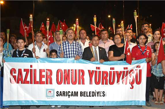 Şehit aileleri, gaziler ve Sarıçamlılarla birlikte Belediye Başkanı Bilal Uludağ’ın da katıldığı yürüyüşte ‘Şehitler ölmez vatan bölünmez’ sloganları atıldı. Kozan Yolu üzerinde bulunan Bayrak Parkı’nda toplanan yaklaşık 300 kişi burada Büyükşehir Belediyesi Bando ekibi eşliğinde önce şehitler için bir dakikalık saygı duruşunda bulunup İstiklal Marşını okudu. Daha sonra ise Sarıçam Belediye Başkanı Bilal Uludağ, Türkiye Harp Malulü Gaziler Şehit Dul ve Yetimleri Derneği Adana Şube Başkanı Melahat Ongun, Şehit Aileleri Derneği Adana Şube Başkanı Emine Kunt, şehit aileleri ve gazilerden oluşan gurup ellerinde Türk bayrakları ve meşalelerle yaklaşık 2 kilometre yürüdü. Kozan Yolu kanal üzerinde tamamlanan yürüyüş sonrası ise Sarıçam Belediyesi Bahçesine gelen gurupta bulunan şehit aileleri ve gazilere Başkan Uludağ’ın tarafından yemek verildi. Yemek öncesi şehitler için dualar okundu.