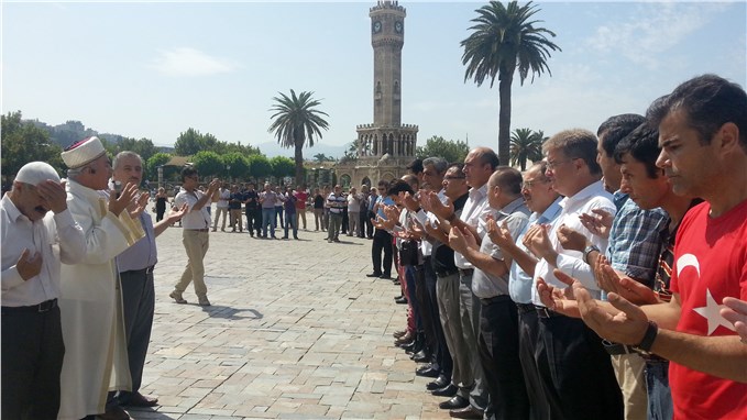 İZMİR - İzmir’de, Dağlıca ve Iğdır’da şehit olan polis ve askerler için gıyabi cenaze namazı kılındı. Türkiye genelinde olduğu gibi İzmir’deki camilerde de öğle namazından önce şehitler için sela verildi. Türkiye Kamu Sen üyeleri de namazın ardından Konak Meydanı’ndaki Konak Camisi’nde gıyabi cenaze namazı kıldı. MHP İzmir Milletvekili Aslan Savaşan ve meydanda bulunan çok sayıda vatandaş da namaza katıldı. Ardından şehit asker ve polisler için eller semaya açılıp dua edildi, Kur'ân okundu.