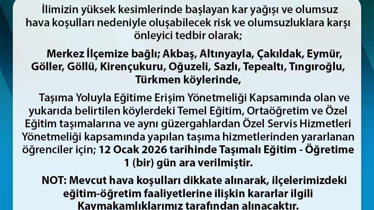 Merkez ilçeye bağlı Akbaş, Altınyayla, Çakıldak, Eymür, Göller, Göllü, Kirençukuru, Oğuzeli, Sazlı, Tepealtı, Tıngıroğlu ve Türkmen köylerinde, Taşıma Yoluyla Eğitime Erişim Yönetmeliği çerçevesinde yürütülen temel eğitim, ortaöğretim ve özel eğitim taşımaları durduruldu. Bu karar, aynı güzergâhlarda Özel Servis Hizmetleri Yönetmeliği kapsamında yapılan öğrenci taşımalarını da kapsıyor.