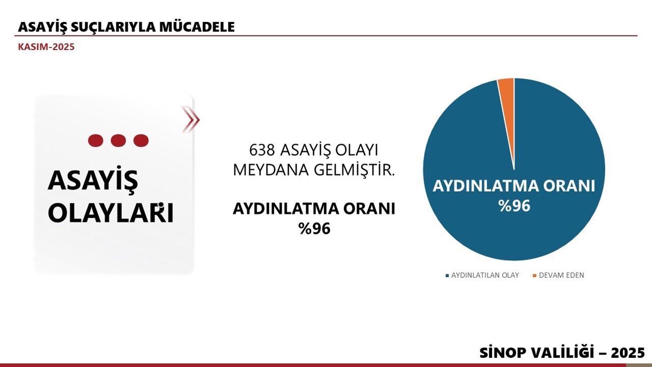 Sinop’ta Kasım ayında meydana gelen asayiş olaylarına dair açıklama yapan Vali Mustafa Özarslan, il genelinde toplam 638 olayın kaydedildiğini ifade etti. Emniyet ve jandarma birimlerinin birlikte yürüttüğü çalışmalar sayesinde bu olayların yüzde 96'sının aydınlatıldığını belirten Özarslan, suçların oluşmadan önlenmesine yönelik uygulamaların aralıksız devam ettiğini vurguladı. Alınan tedbirlerin, toplumun huzurunu korumak açısından büyük önem taşıdığını dile getirdi.