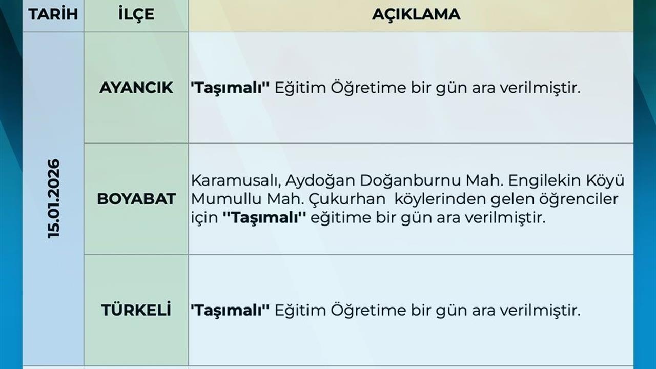 Ayrıca, Boyabat ilçesinin bazı köylerinde de taşımalı eğitime kısmi olarak ara verildiği ifade edildi. Bu durum, öğrencilerin güvenliğini sağlamak amacıyla hayata geçirildi. Taşımalı eğitimin durdurulduğu bölgelerde görev yapan engelli ve hamile kamu görevlilerinin aynı gün idari izinli sayılacağı da vurgulandı. Bu kapsamda, eğitim kurumlarında güvenli bir ortam sağlanması için gerekli tedbirlerin alınacağı belirtildi.