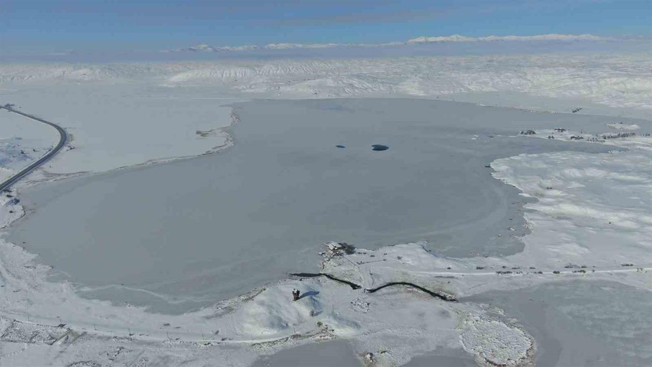 5 kilometrekarelik bir alana sahip olan Tödürge Gölü, Sivas'ın en büyük gölü olma özelliğini taşıyor. Yaklaşık 50 metre derinliği bulunan göl, bu kış tamamen buzla kaplanarak görenleri büyüleyen bir manzara sunuyor. Gölün havadan çekilen dron görüntüleri, donmuş yüzeyi ve çevresindeki beyaz örtüyle birlikte kartpostallık bir görünüm oluşturuyor. Tödürge Gölü, yaz aylarında binlerce göçmen kuşun konakladığı bir alan olarak bilinse de kışın ortaya çıkan bu farklı atmosfer, doğaseverler için ilgi çekici bir deneyim sunuyor.