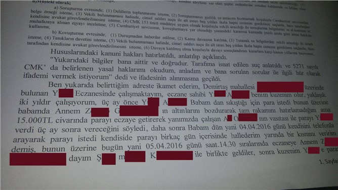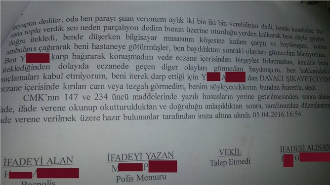 İ.P. isimli mağdur bayan şunları söyledi: “Dün 05 Nisan 2016 Salı günü 14:30 sıralarında Ecz. Y.A. alacağımız olan 20 bin liranın, 1 nisan 2016 tarihinde ödeme sözü verdi. Aynı zamanda akrabamız olan Y.A. söz verdiği tarihte ödemeyi yapmadığı için, annen ve dayım konuşmak üzere eczaneye geldi. Eczacı, borcu olan 20 bin lira için aileme "alırken ben sizden yalvardım sizde benden geri alırken yalvaracaksınız" gibi söylemlerde bulundu. Bu sözleri üzerine eczacı teknikeri olarak yanında çalıştığım ve aynı zamanda akrabamız olan Y.A. "Biz sana toplu para verdik sen bize 2 bin liradan bahsediyorsun bu şekilde nasıl olacak" derken eliyle sert bir şekilde itti. O esanada ben dengemi kaybederek yanımızda bulunan bilgisayar masasına kafamı çarparak yere düşmüşüm, olay yerine ambulans çağrılarak hastaneye götürüldüm. Yaşanan bu olayın ardından doktorların verdiği darp raporu ile karakola giderek Annem, Dayım ve ben patronum ve aynı zamanda akrabamız olan Ecz. Y.A.’dan şikayetçi olduk.