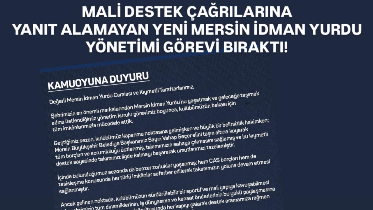 Yeni Mersin İdman Yurdu Yönetim Kurulu, kulübün sosyal medya hesapları üzerinden yayımladığı kamuoyu duyurusu ile istifa ettiğini açıkladı.