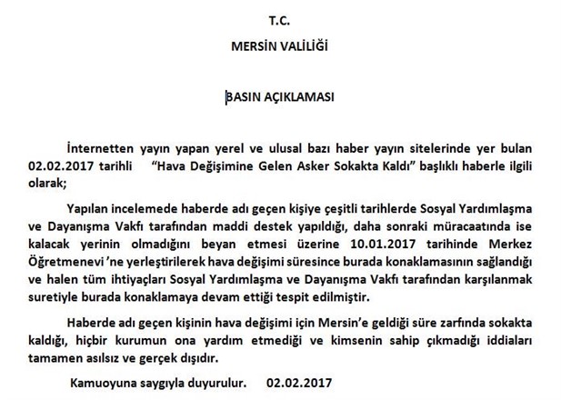 Mersin Valiliğ tarafından yazılı açıklamaya göre'' haberde adı geçen asker 'e çeşitli tarihlerde Sosyal Yardımlaşma ve Dayanışma Vakfı tarafından maddi yardımlar yapıldığı,daha sonraki müracatında da kalacak yeri olmadığı beyanı üzerine 10.01.2017 tarihinde Merkez Öğretmenevi'ne yerleştirildiği hava değişimi süresince burada konaklamasının sağlandığı ve halen tüm ihtiyaçlarının Sosyal Yardımlaşma ve Dayanışma Vakfı tarafından karşılanmak suretiyle burada konaklamaya devam ettiği tesbit edilmiştir'' denildi.