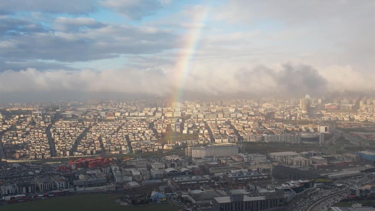 İstanbul Beylikdüzü'nde sabah saatlerinde yağan yağmurun ardından gökkuşağı oluştu. Bu görsel şölen, dron ile havadan kaydedildi ve görenler üzerinde etki yarattı.