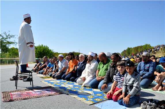 Edirne Valisi Dursun Ali Şahin de Cuma namazını şehir merkezindeki bir cami yerine sığınmacılarla birlikte kılmayı tercih etti. Namaz öncesinde otoyola giren vali, Suriyeli cemaatle birlikte saf tuttu. İlk olarak Arapça vaaz verildi. Vaazın ardından Türk müezzin ezan okudu. Kurban Bayramı konusunun işlendiği Cuma hutbesi Türkçe ve Arapça olarak okundu. CİHAN
