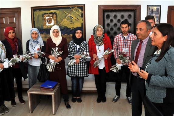 MERSİN - Mersin Üniversitesi (MEÜ) Dünya Kültürleri Topluluğu öncülüğünde bir araya gelen Suriyeli üniversite öğrencileri, Suriyeli mültecilere gösterilen konukseverliğe teşekkür etti. Öğrenciler, 'Bir Çiçek Bin Teşekkür, İnsanlığımız Gülden Başlar' projesi çerçevesinde Akdeniz Belediyesi Eş Başkanı Yüksel Mutlu’yu makamında ziyaret ederek gül verdi. Öğrenciler daha sonra belediye personeline de gül dağıttı.