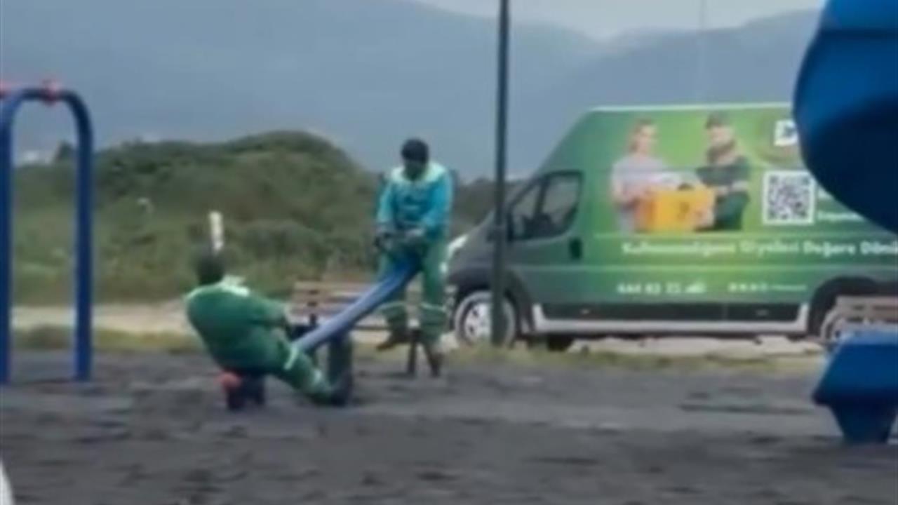 Bursa'nın Osmangazi ilçesinde görevli temizlik işçileri, yoğun çalışma temposu arasında parkta bulunan tahterevalliye binerek keyifli anlar yaşadı. Bu eğlenceli görüntüler, bir arkadaşları tarafından cep telefonuyla kaydedildi ve sosyal medya hesaplarında paylaşıldı. Görüntülerde, işçilerin çocukluklarına dönmüş gibi mutlu anlar geçirdiği dikkat çekti.