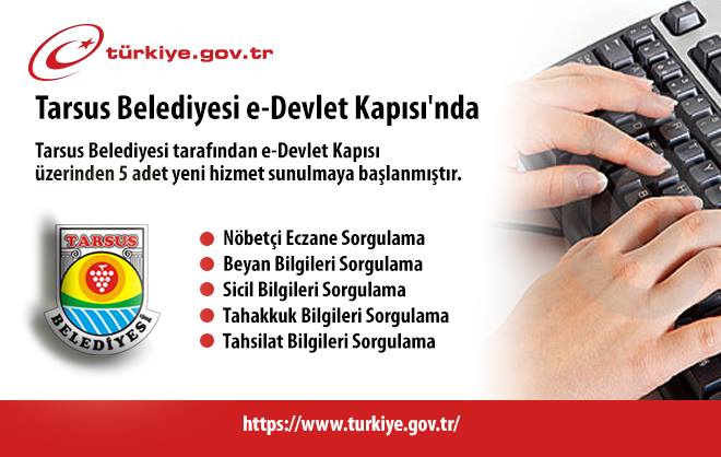 Tarsus Belediyesi e-Devlet üzerinde ‘Nöbetçi Eczane Sorgulama, Beyan Bilgileri Sorgulama, Sicil Bilgileri Sorgulama, Tahakkuk Bilgileri Sorgulama ve Tahsilat Bilgileri Sorgulama’ hizmetini verecek.