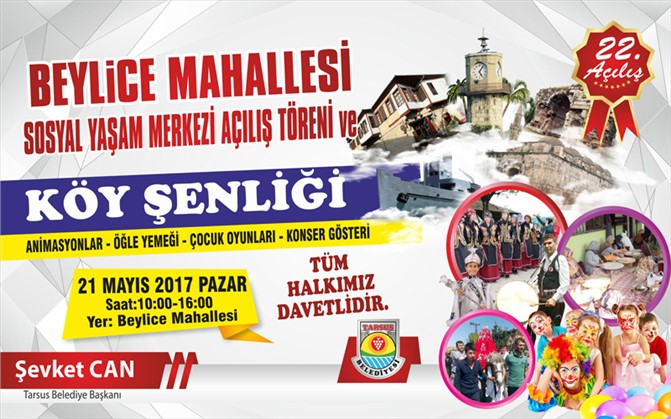 Tarsus Belediyesi tarafından kırsal mahallelere hitap etmek amacıyla düzenlenen ‘Bereket Diyarı Tarsus Köy Şenlikleri’nin üçüncüsü 21 Mayıs 2017 Pazar günü Beylice Mahallesi’nde yapılacak. Etkinlikler kapsamında Beylice Mahallesi’nde yapılan Sosyal Yaşam Merkezi’nin açılışı da yapılacak.