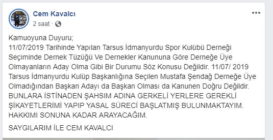 “11/07/2019 Tarihinde Yapılan Tarsus İdmanyurdu Spor Kulübü Derneği Seçiminde Dernek Tüzüğü Ve Dernekler Kanununa Göre Derneğe Üye Olmayanların Aday Olma Gibi Bir Durumu Söz Konusu Değildir. 11/07/ 2019 Tarsus İdmanyurdu Kulüp Başkanlığına Seçilen Mustafa Şendağ Derneğe Üye Olmadığından Başkan Adayı da Başkan Olması da Kanunen Doğru Değildir. Bunlara istinaden şahsım adına gerekli yerlere gerekli şikayetlerimi yapıp, yasal süreci başlatmış bulunmaktayım.”