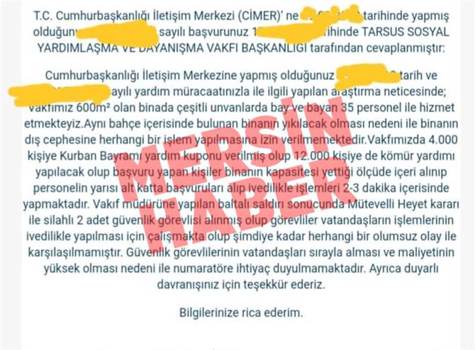 Geçen yıl A.B. isimli bir vatandaş, CİMER üzerinden 28.08.2018 tarihinde Tarsus Sosyal Yardımlaşma ve Dayanışma Vakfı’nda yaşanan sıra ve dışarıda sıcak altında bekleme şikayeti ile ilgili yaptığı şikayetine vakıf yetkililerinden gelen cevap pes dedirtti.