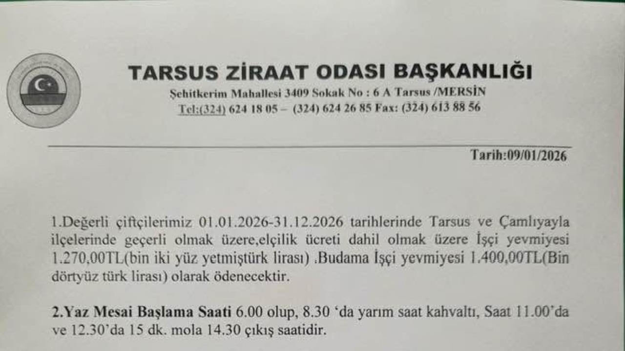 Mersin Tarsus Şehitkerim Mahallesi 3409 Sokak. Tarsus Ziraat Odası Başkanlığı tarafından Tarsus ve Çamlıyayla ilçelerinde 2026 yılı boyunca geçerli olacak tarım işçiliği ücretleri ve çalışma şartları belirlendi.