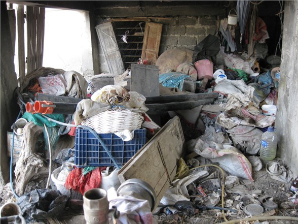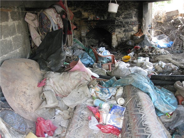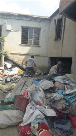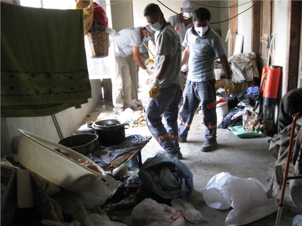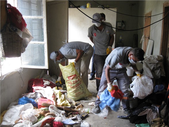Ekipler Tarafından 4 kamyon çöp çıkarılan evdeki çöpler alınarak çöp deposuna kaldırılırken evin ve çevrenin ilaçlaması Temizlik İşleri Müdürlüğü ekipleri tarafından yapıldı.
