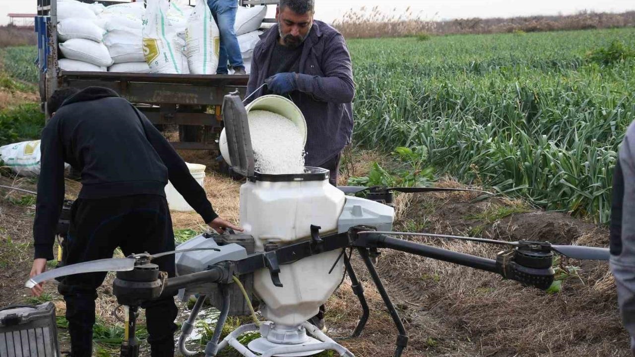 Bu çerçevede Mersin’in Tarsus ilçesinde bulunan 200 dönümlük pırasa tarlasında dronla gübreleme çalışması gerçekleştirildi. 50 kilo taşıma kapasiteli dronlara yüklenen gübreler, kısa sürede ve dengeli şekilde araziye uygulandı. 2 işçinin 3-4 saatte yapabileceği işi yarım saatte yapan dronun dönüm başına üreticiye ise yaklaşık 120 TL civarında maliyeti olduğu öğrenildi.