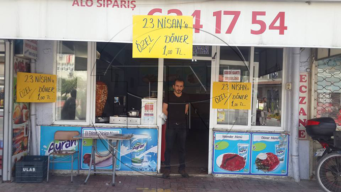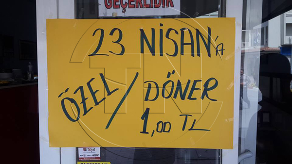 İş yerinin camlarına "23 NİSAN'A ÖZEL DÖNER 1 TL" şeklinde ilanları gören vatandaşların önce şaşkınlık yaşadığı görülürken, bazı vatandaşlarda bu indirimde yararlanmak için soluğu dönercide aldı.