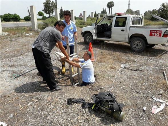 Olay yerine gelen Mersin Büyükşehir Belediye İtfaiyesi Tarsus Grup Amirliği ekipleri kazı sağ salim çıkarmak için çalışma başlattı.