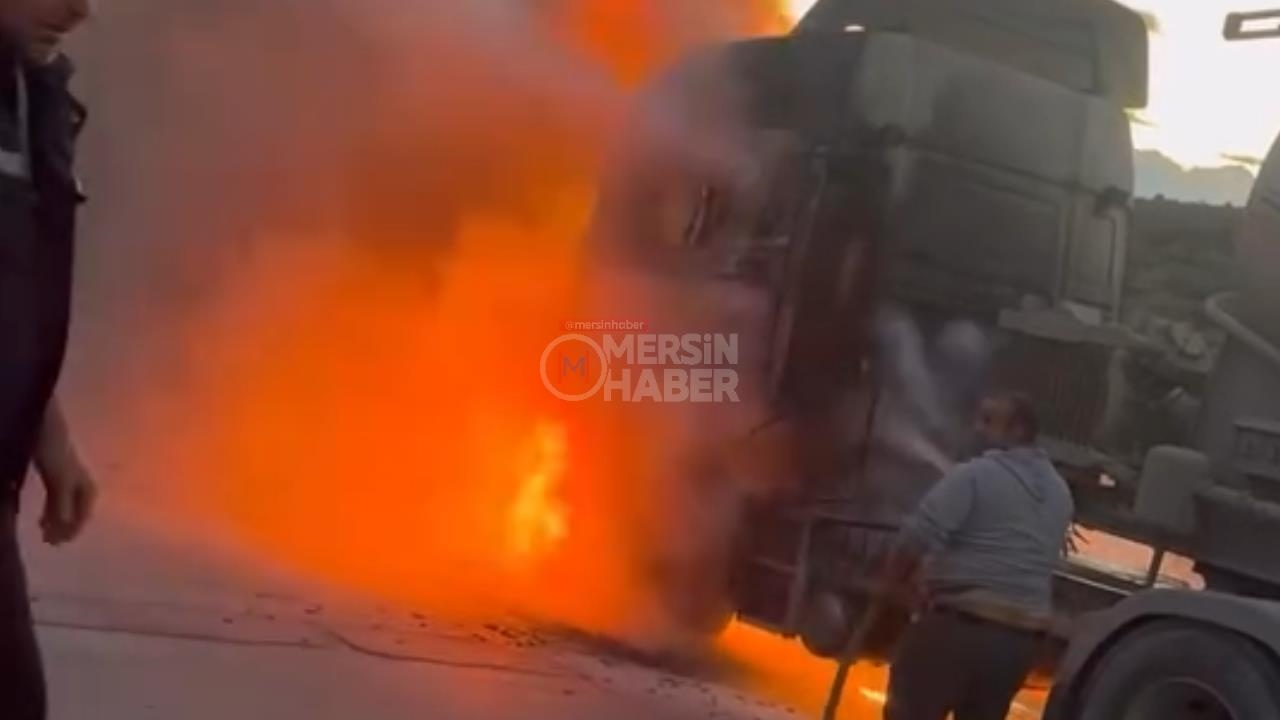 Olay, Taşucu Medcem tesisleri yakınlarında, karayolu üzerinde meydana geldi. Seyir halinde olan bir silobazın çekici (ön) kısmında yangın çıktı. Alevler kısa sürede çekiciyi sararken, silobazın yüküne sıçrama tehlikesi oluştu.