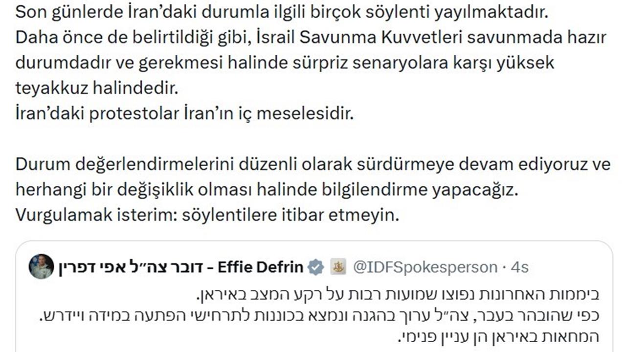 İsrail ordusu, İran'da 28 Aralık'tan bu yana devam eden protesto gösterilerine dair önemli açıklamalarda bulundu. IDF Sözcüsü Effie Defrin, sosyal medya platformu X'te yaptığı paylaşımda, İran'daki olayların ve İsrail'in durumu hakkında birçok söylenti yayıldığını belirtti. Defrin, "İsrail Savunma Kuvvetleri (IDF) savunmada hazır durumdadır ve gerekmesi halinde sürpriz senaryolara karşı yüksek teyakkuz halindedir. İran'daki protestolar İran'ın iç meselesidir" dedi.