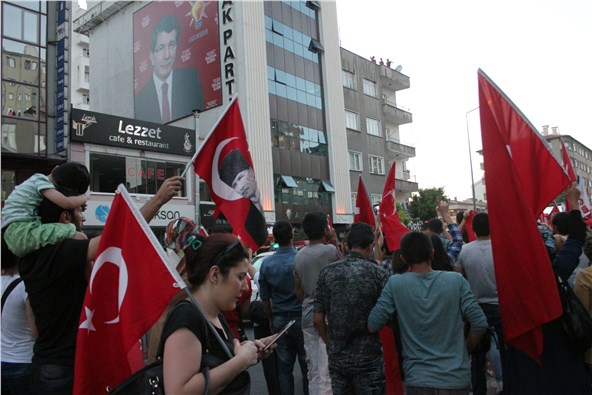 Polis AK Parti binası önünde panzerli ve robokoplu önlem aldı. Türk bayraklarıyla yürüyerek parti binası önüne gelen kalabalık burada terör örgütü ve AK Parti aleyhine slogan attı. Grup parti binasına Türk bayrağı asılmadığını ileri sürerek tepki gösterdi. Buraya uyarı amaçlı geldiklerini söyleyen bir kişi eline mikrofonu alarak kalabalığa konuştu. Söz konusu şahıs, “Eğer bu kan akmaya devam ederse, bu binaların altında kalacaklar.” tehdidinde bulundu.