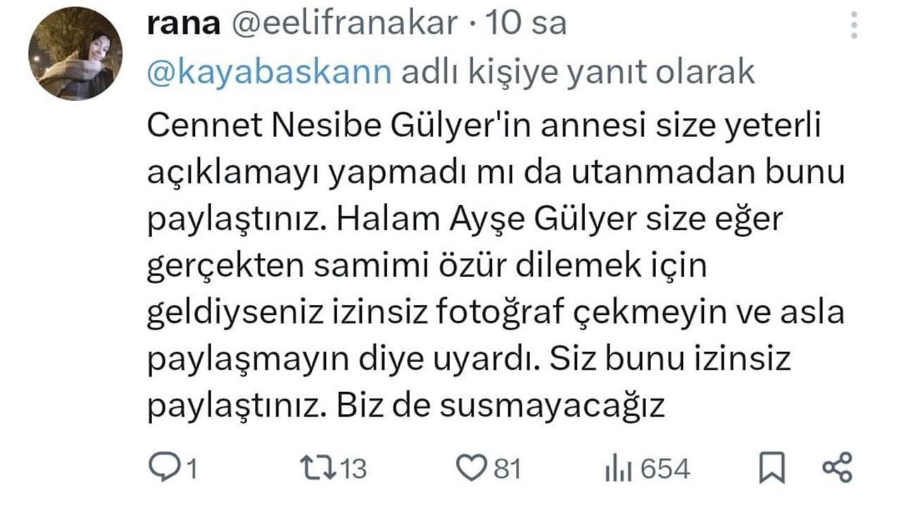 Hastane odasında tedavi gören Cennet Nesibe Gül’ün ailesi, Başkan Kaya'dan ve beraberindeki basın ekibinden, kızlarıyla ilgili görüntü ve fotoğraf alınmamasını rica etti. Ancak, ziyarette çekilen görüntüler, Başkan Kaya tarafından sosyal medya hesabında paylaşıldı. Bu durum, ailenin tepkisini çekti. Sosyal medya üzerinden de tepkilerini dile getiren aile üyeleri, Gül’ün kuzeni Halam Ayşe Gülyer, "Gerçekten samimi özür dilemek için geldilerse, izinsiz fotoğraf çekmemeli ve paylaşmamalıdır." ifadelerini kullandı. Genç kızın yakınları, "Siz bunu izinsiz paylaştınız. Biz de susmayacağız." derken, "Açık rıza olmaksızın görüntüsünün paylaşılması, 6698 sayılı KVKK kapsamında kişisel veri ihlalidir. Kişilik haklarının ve özel hayatın gizliliğinin ihlali söz konusudur. İçeriğin derhal kaldırılmasını ve gerekli hukuki sürecin başlatılacağını bildiriyoruz." şeklinde açıklamada bulundular.