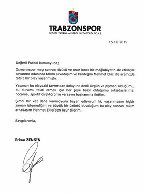 Trabzonspor’da Erkan Zengin, Süper Lig'in 6. haftasında Osmanlıspor'a 3-1 mağlup oldukları maçın ardından soyunma odasında tartıştığı ve yumruk attığı iddia edilen takım arkadaşı Mehmet Ekici'den özür diledi.