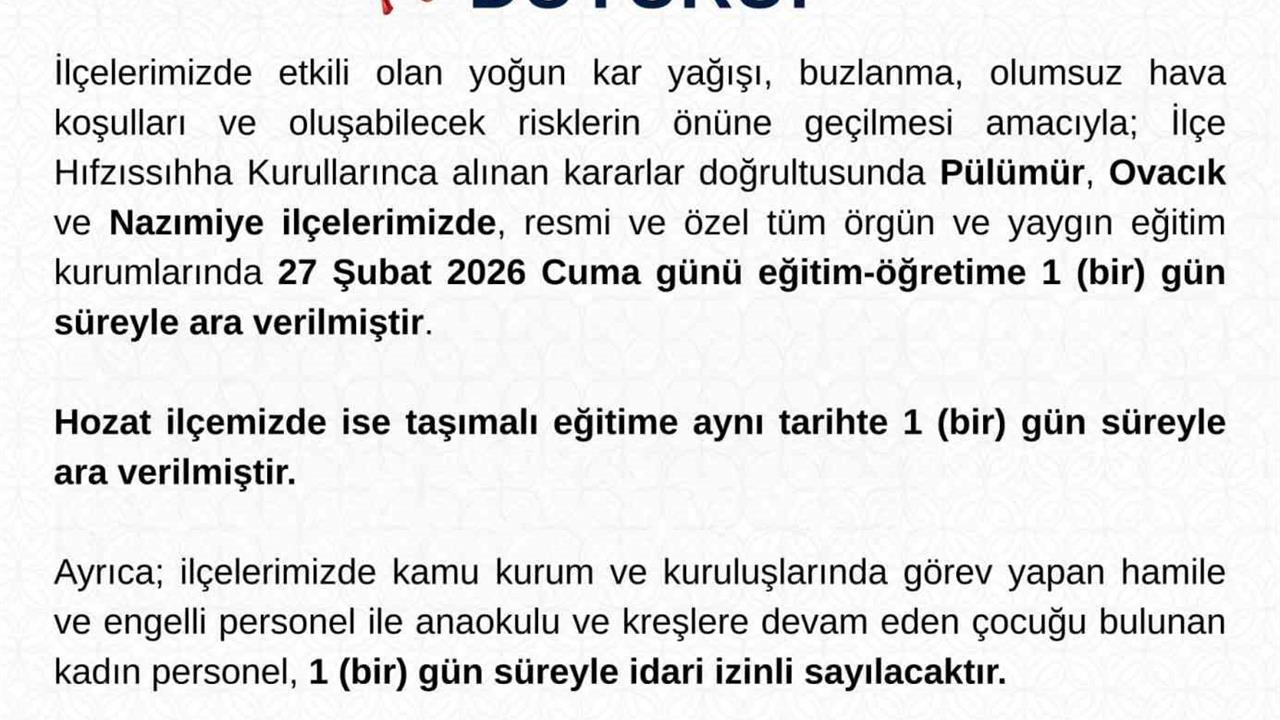 Tunceli Valiliği'nden alınan bilgilere göre, ilçelerde etkili olan yoğun kar yağışı ve buzlanma gibi olumsuz hava koşulları nedeniyle eğitim-öğretime ara verildi. Bu kapsamda, Pülümür, Ovacık ve Nazımiye ilçelerinde, resmi ve özel tüm örgün ve yaygın eğitim kurumlarında 27 Şubat 2026 Cuma günü eğitim-öğretime 1 gün süreyle ara verilmesi kararlaştırıldı. Hozat ilçesinde ise sadece taşımalı eğitime aynı tarihte 1 gün süreyle ara verileceği bildirildi. Ayrıca, bu süreçte kamu kurum ve kuruluşlarında görev yapan hamile ve engelli personel ile anaokulu ve kreşlere çocuğu bulunan kadın personelin 1 gün süreyle idari izinli sayılacağı ifade edildi.