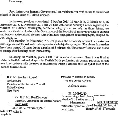 BİRLEŞMİŞ MİLLETLER - Türkiye’nin New York’taki BM Daimi Temsilciliği, Rus savaş uçağının düşürülmesi ile ilgili Birleşmiş Milletler Güvenlik Konseyi Dönem Başkanı Büyükelçi Matthew Ryeroft ve BM Genel Sekreteri Ban Ki-mun’a hitaben mektup yazdı.
