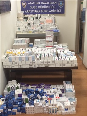Atatürk Havalimanı'ndan kaçak yollarla yurt dışına götürülmek istenen çok sayıda ilaç havalimanı polisi tarafından yakalandı. Çarşamba günü dış hatlar gidiş katında Atatürk Havalimanı Şube Müdürlüğü Araştırma Büro Amirliği ekipleri, 2 Türk yolcunun bagajlarında arama yaptı. Şahısların valizlerinde, yurt dışına götürülmek istenen toplam 2 bin 414 kutu ilaç tespit edildi. Şahıslar hakkında 5607 Sayılı Kaçakçılıkla Mücadele Kanunu ve Türk Ceza Kanunu'nun dolandırıcılık suçu maddelerinden işlem yapıldı.