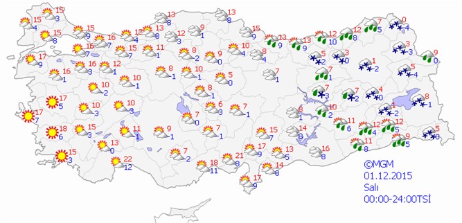 Yapılan son değerlendirmelere göre: Ülkemizin genelinin parçalı ve çok bulutlu, Marmara'nın doğusu, İç Ege, Akdeniz, İç Anadolu, Karadeniz ile Doğu ve Güneydoğu Anadolu bölgelerinin aralıklı yağışı geçmesi bekleniyor. Genellikle yağmur ve sağanak, yer yer gök gürültülü sağanak, Doğu Anadolu'nun kuzey ve doğusu, Doğu Karadeniz'in iç kesimleri, Bursa-Uludağ, Bilecik, Kütahya, Afyonkarahisar, Çankırı, Bolu, Kastamonu'nun yüksekleri ile zamanla Yozgat, Sivas ve Kayseri'nin yüksek kesimlerinin karla karışık yağmur ve yer yer kar yağışı şeklinde olması beklenen yağışların; Doğu Akdeniz, Doğu Karadeniz, Malatya, Elazığ, Tunceli, Erzincan, Bingöl, Gaziantep, Kilis, Adıyaman, Batman, Siirt ile Diyarbakır ve Mardin'in doğu ilçelerinde kuvvetli yağmur ve sağanak, yarın(salı) sabah saatlerinde Doğu Karadeniz'in iç kesimleri ile Elazığ, Tunceli, Erzincan, Bingöl, Muş, Bitlis, Şırnak, Hakkari ve Erzurum'un batı kesimlerinde yoğun kar şeklinde olması bekleniyor.