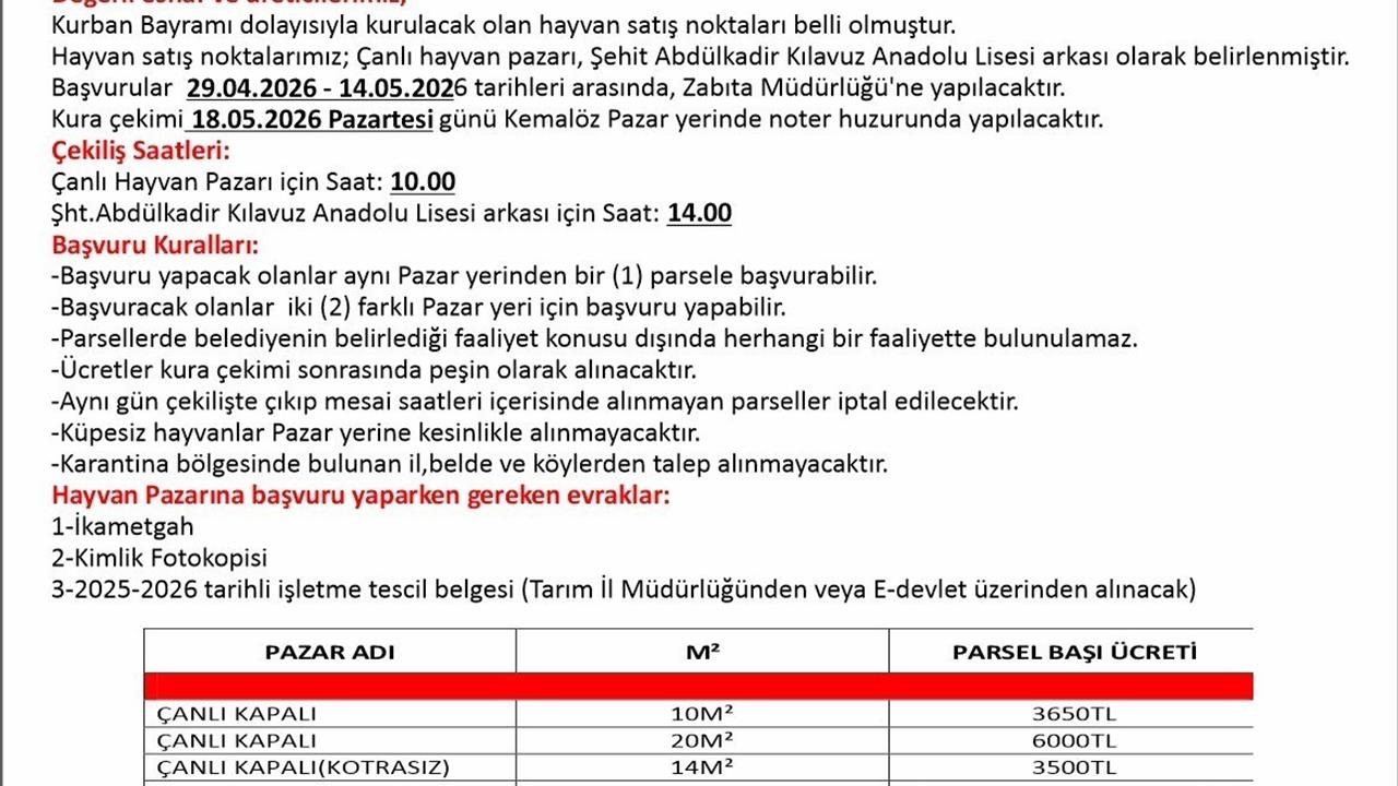 Kurban pazarına başvuru yapmak isteyenlerin, ikametgah ve kimlik fotokopisinin yanı sıra Tarım İl Müdürlüğü’nden ya da E-devlet üzerinden alınacak 2025-2026 tarihli işletme tescil belgesini de hazırlamaları gerekiyor. Tüm bu belgelerin eksiksiz bir şekilde Zabıta Müdürlüğü’ne teslim edilmesi büyük önem taşıyor.