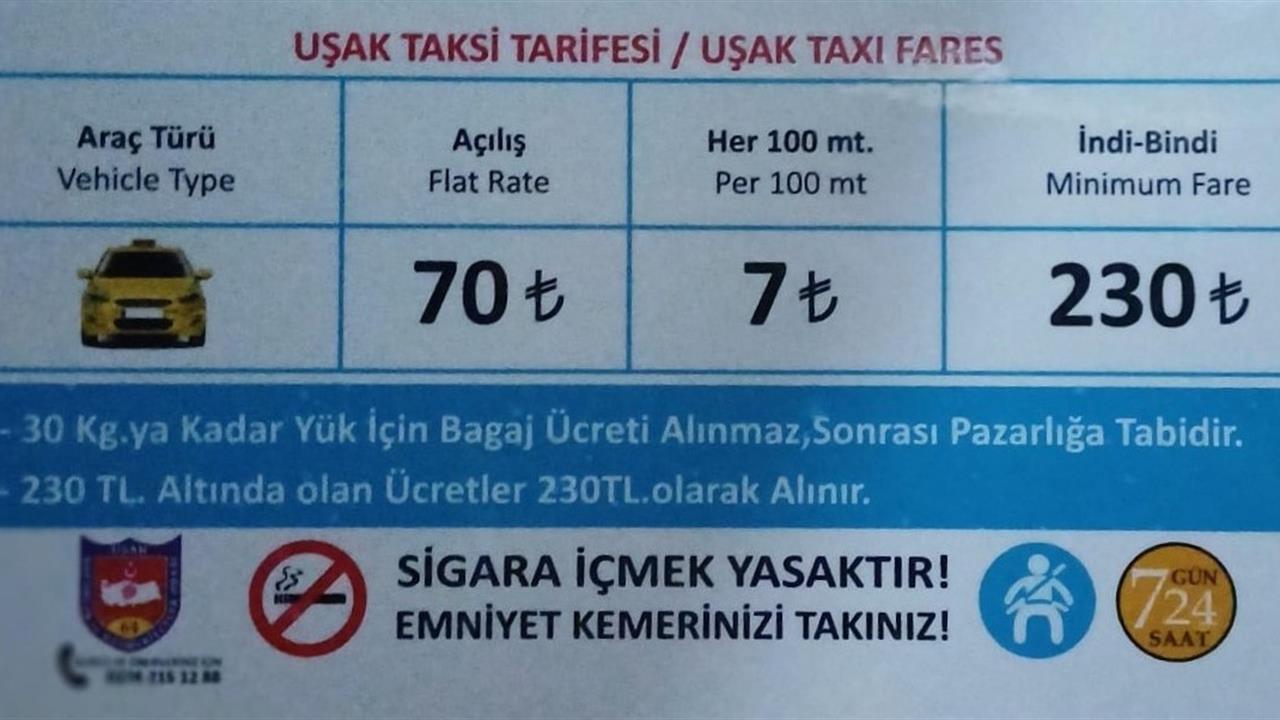 Uşak’ta, birçok ilde olduğu gibi, taksi fiyatları için bir zam uygulandı. Uşak Şoförler ve Otomobilciler Esnaf Odası tarafından yapılan açıklamada, yeni tarifelerin detayları paylaşıldı. Açılış ücreti 50 TL’den 70 TL’ye yükseltilirken, kilometre başı ücret 50 TL’den 70 TL’ye çıkarıldı. İndi-bindi ücreti ise 170 TL’den yapılan yüzde 35,29’luk bir artışla 230 TL’ye ulaştı. Bu yeni tarifelerin 18 Mart tarihinden itibaren geçerli olduğu bildirildi.