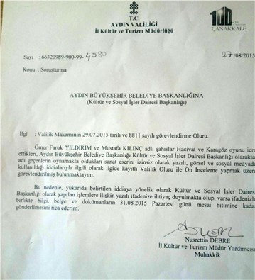 AYDIN - Aydın Valiliği, Aydın Büyükşehir Belediyesi’nin Kültür ve Sosyal İşler Dairesi Başkanlığı hakkında 'Hacivat ve Karagöz' orta oyununu izinsiz oynattırdığı için soruşturma başlattığı ortaya çıktı. Aydın Valiliği İl Kültür Müdür Yardımcısı Nusrettin Debre, Aydın Büyükşehir Belediyesi Kültür ve Sosyal İşler Dairesi Başkanlığı’na yazdığı resmi yazıda, soruşturma için görevlendirildiğini belirtti.