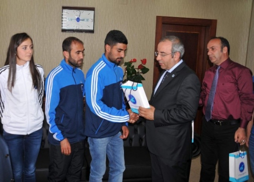 Van Yüzüncü Yıl Üniversitesi'nde, farklı alanlarda elde ettikleri başarılarla dikkat çeken sporcu öğrenciler, Rektör Prof. Dr. Peyami Battal tarafından makamında kabul edildi. Rektör Battal, 9-11 Nisan 2015 tarihlerinde Bolu'da düzenlenen Oryantring Türkiye Şampiyonası'nda bireysel dalda birinci olan milli sporcu Şakire Bilgin'i, 26-30 Nisan tarihlerinde Kars'ta gerçekleştirilen Türkiye Boks Şampiyonası'nda üçüncü olan milli sporcu Remzi Uyar'ı, 9-11 Mayıs tarihlerinde Isparta'da yapılan Atletizm Türkiye Şampiyonası'nda 5 bin metrede ikinci olan Mehmet Akkoyun'u ve 1500 metrede ikinci gelen milli sporcu Şeref Dirli'yi kutladı. Bu başarılı öğrencilerin her birine çeşitli hediyeler vererek ödüllendiren Rektör Battal, üniversitenin spor alanındaki gelişimine de vurgu yaptı.