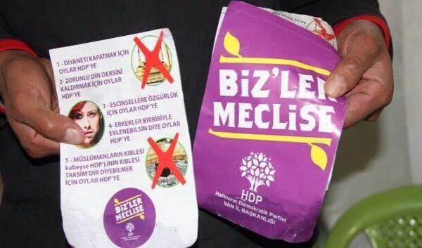 Van'ın Erciş ilçesinde kimliği belirsiz kişilerce HDP Van İl Örgütü imzalı asılsız bildiriler basılarak dağıtılmaya başlandı. Gece geç saatlerde beyaz renkli Fiat marka araç ve bisikletlerle dağıtıldığı belirtilen bildirilerde, HDP'yi karalayan, 'Diyaneti kapatmak için oylar HDP'ye', 'Zorunlu din dersini kaldırmak için oylar HDP'ye', 'Eşcinsellere özgürlük için oylar HDP'ye', 'Erkekler birbirleri ile evlenebilsin diye oylar HDP'ye', 'Müslümanların kıblesi Kabe ise HDP'lilerin kıblesi Taksim'dir diyebilmek için oylar HDP'ye' şeklindeki ifadelere yer verildi.