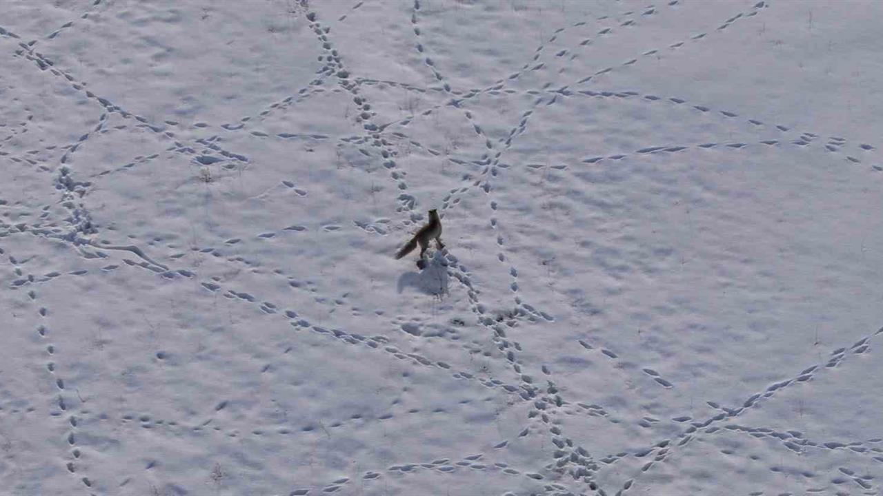 Van'da karla kaplı arazide yiyecek arayan kızıl tilkinin avlanma anı dron kamerasıyla görüntülendi. Dron, tilkinin avını yakalamak için gösterdiği ustalığı kaydederek izleyenleri etkileyen doğa manzaraları sundu.