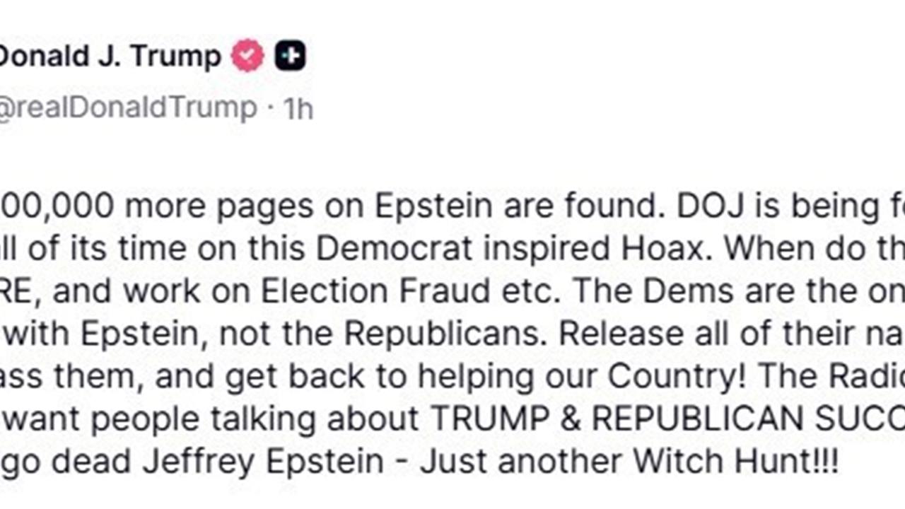 Trump, Epstein ile ilişkisi olan kişilerin Cumhuriyetçiler değil, Demokratlar olduğunu iddia ederek, Adalet Bakanlığı'na bu kişilerin isimlerini açıklama çağrısında bulundu. Ayrıca, "Gerçekten ülkemize hizmet etmeye geri dönün" diyerek, siyasi gündemin başka konularla meşgul edilmemesi gerektiğini belirtti. Radikal solun kendisinin ve Cumhuriyetçilerin başarıları hakkında konuşmaktan kaçındığını ifade eden Trump, "Onun yerine Epstein gibi ölmüş birini gündemde tutmaya çalışıyorlar. Bu, sadece bir cadı avı" dedi.