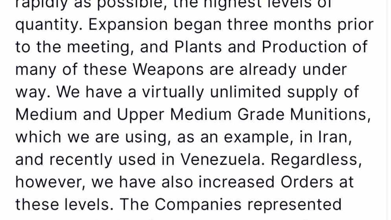 Trump, bu silahların üretim kapasitesini artırma sürecinin toplantıdan üç ay önce başladığını ve ilgili fabrikaların inşasının devam ettiğini belirtti. "Orta ve üst-orta sınıf mühimmat açısından neredeyse sınırsız bir tedarikimiz var. Bunları örneğin İran’da kullanıyoruz ve yakın zamanda Venezuela’da da kullandık. Buna rağmen bu sınıftaki mühimmat için siparişlerimizi de artırdık" ifadelerini kullandı.