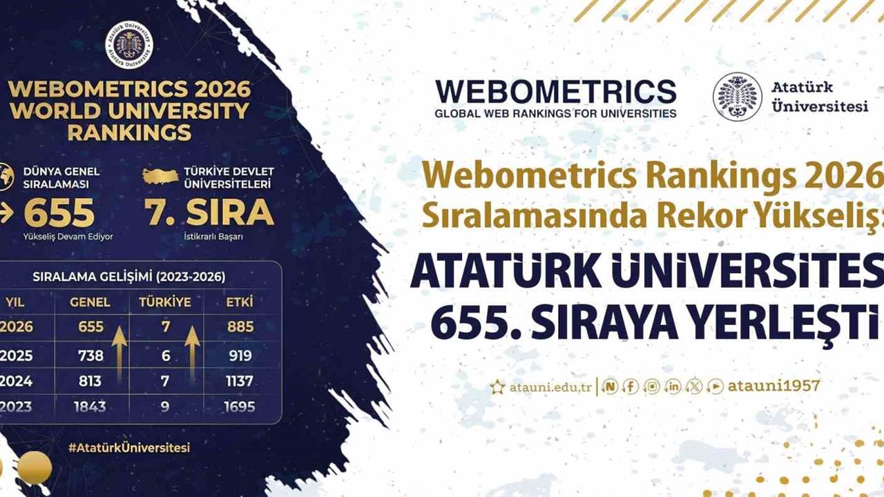 Atatürk Üniversitesi, Webometrics sıralamasında 655. sıraya çıkarak önemli bir başarıya imza attı. 2023 yılında 1843. sırada yer alan üniversite, 2024’te 813’e, 2025’te 738’e ve 2026 raporunda ise 655. sıraya yükselerek üç yıl içinde yaklaşık bin 200 basamak tırmandı. Bu yükseliş, üniversitenin son yıllardaki istikrarlı gelişimini açıkça göstermektedir.