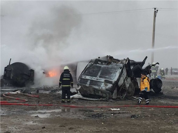 Yakıt tankerinin, kum yüklü TIR ile çarpışması sonucu patlama meydana geldi. Ardından araçlar alev topuna döndü. İlk belirlemelere göre 2 kişi yaşamını yitirdi. İtfaiye ekipleri alevleri söndürmek için çalışmasını sürdürüyor. Çevrede toplanan vatandaşlardan bazıları ise o anları sosyal medya hesabından canlı olarak yayınladı.