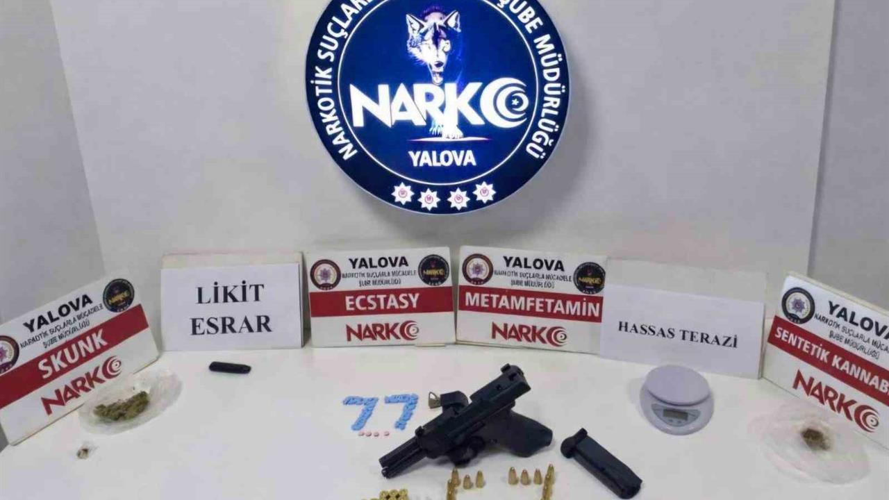 Yalova'da, Emniyet Müdürlüğü İstihbarat ve Narkotik Suçlarla Mücadele Şube müdürlükleri tarafından yapılan risk analizi sonucunda, kent merkezinde ve İstanbul ilinde düzenlenen operasyonlar neticesinde 6 şüpheli gözaltına alındı. Edinilen bilgilere göre, bu operasyonlarda 242,75 gram çeşitli uyuşturucu ve uyarıcı maddeler ile 64 adet uyuşturucu hap, hassas terazi, 9 mm çapında bir tabanca, 1 şarjör ve 39 adet fişek ele geçirildi.