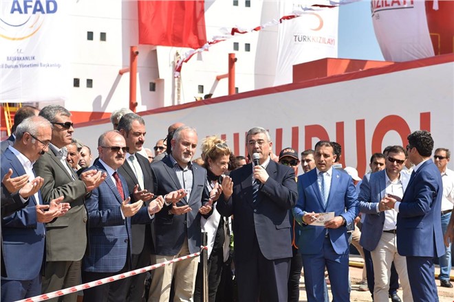 Silifke ilçesi Taşucu Limanı’nda gerçekleştirilen uğurlama töreninde bir konuşma yapan Başbakan Yardımcısı Kaynak; Afrika’da açlık çeken, kuraklıktan ve iç savaştan dolayı her gün binlerce insanın öldüğü coğrafyada yaşayan mazlumlara bugün gerçekleştirilen tören ile bir gemi dolusu muhabbetin ve dostluğun gönderildiğini ifade etti. Geçen sene yine Ramazan ayında Mersin limanından uğurlanan Leydi Leyla gemisiyle Gazze’de vahşice uygulanan ambargodan dolayı çok büyük sıkıntılar çeken mazlumlara el uzatıldığını anımsatan Başbakan Yardımcısı Veysi Kaynak, Türkiye’nin Ay Yıldızlı Al Bayrağını ve Türk Kızılayı’nın Kırmızı Hilalini gören insanların yüzünde oluşan sevincin ve coşkunun görülmeye değer olduğunu belirterek, “Dünyada sadece o coğrafyaya kendilerini sömürmek için değil, bir şeyler vermek için gelenin Türkiye Cumhuriyeti Devleti ve Hükümeti olduğunu bilen milyonlar var” dedi.