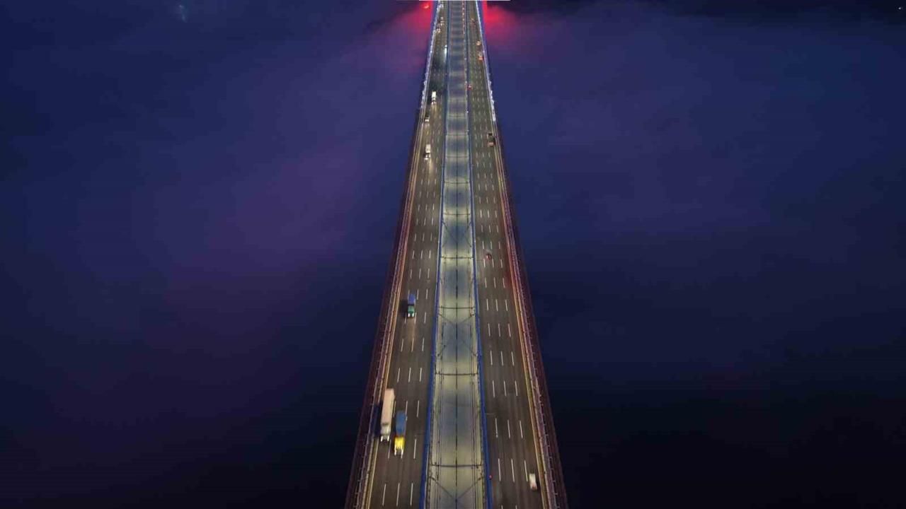Akşam saatlerinde mavi tonlarla birleşen sis, köprü ve çevresinde büyüleyici bir atmosfer oluşturdu. Özellikle yüksek kesimlerde etkisini artıran sis nedeniyle köprünün kuleleri zaman zaman tamamen gözden kayboldu.
