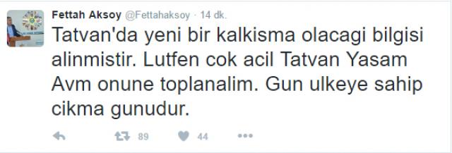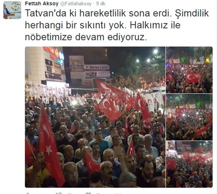 BELEDİYE BAŞKANI: TOPLANIN Sosyal medya'da Tatvan Belediye Başkanı Fettah Aksoy "Tatvan'da yeni bir kalkışma olacağı bilgisi alınmıştır. Lütfen çok acil Tatvan Yaşam AVM önüne toplanalım. Gün ülkeye sahip çıkma günüdür" açıklaması yaptı. Gazeteci Nevzat Çiçek Tatvan belediye başkanı ile görüştüğünü belirterek şu ifadeleri paylaştı: SORGUN KIŞLASINDA KALKIŞMA "Tatvan belediye başkanı Fettah Aksoy Sorgun Kışlasında bir kalkışma var halkı sokağa çağırıyor. Belediye başkanı kendilerine çok ciddi bilgi geldiğini iş makinaları ile her yeri kapattıklarını ve darbecilerin derdest edilmeden Ayrılmayacaklarını ifade ederek şuan Tatvan Halkının sokakta olduğunu ifade ediyor"
